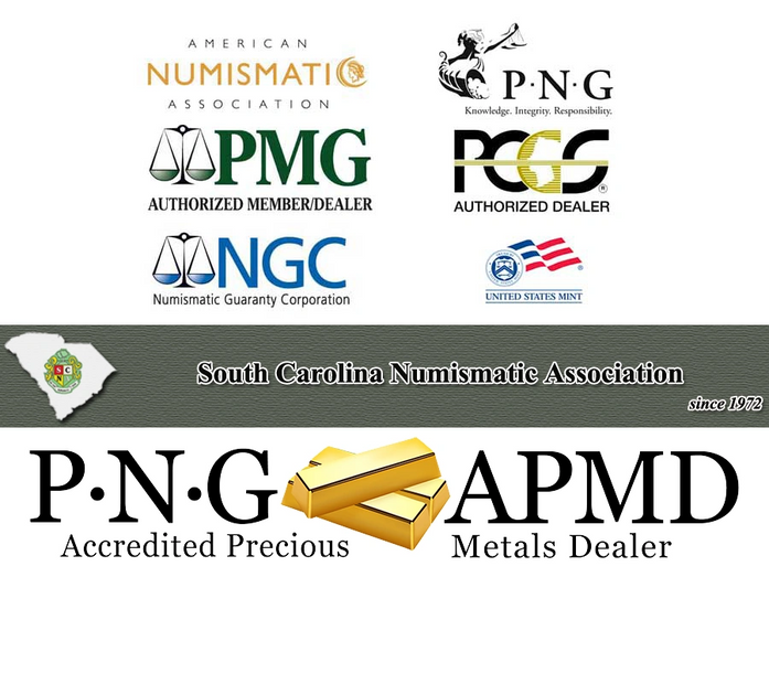 Known for rare coins, Palmetto Galleries in Columbia, SC also buys and sells gold, silver, and platinum bullions. We also buy and sell sterling flatware and service pieces, old or broken gold and silver jewelry, and previously owned Rolex watches. We are Professional Numismatists Guild (PNG) members and a Professional Coin Grading Services (PCGS) and Numismatic Guaranty Corporation (NGC) dealer.